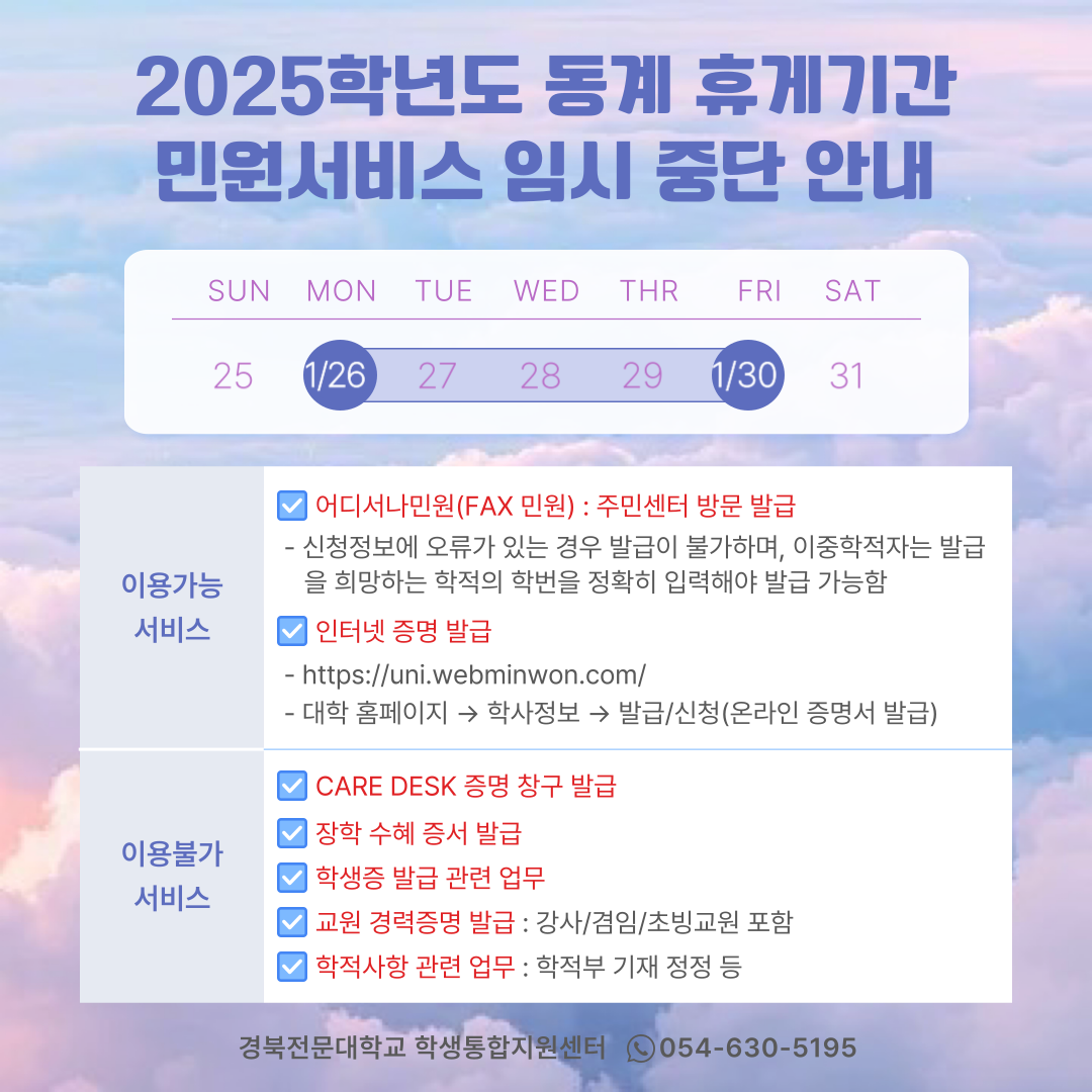 - 학사공지 2025학년도 동계 휴게기간 민원서비스 임시 중단 안내 2026.01.12
